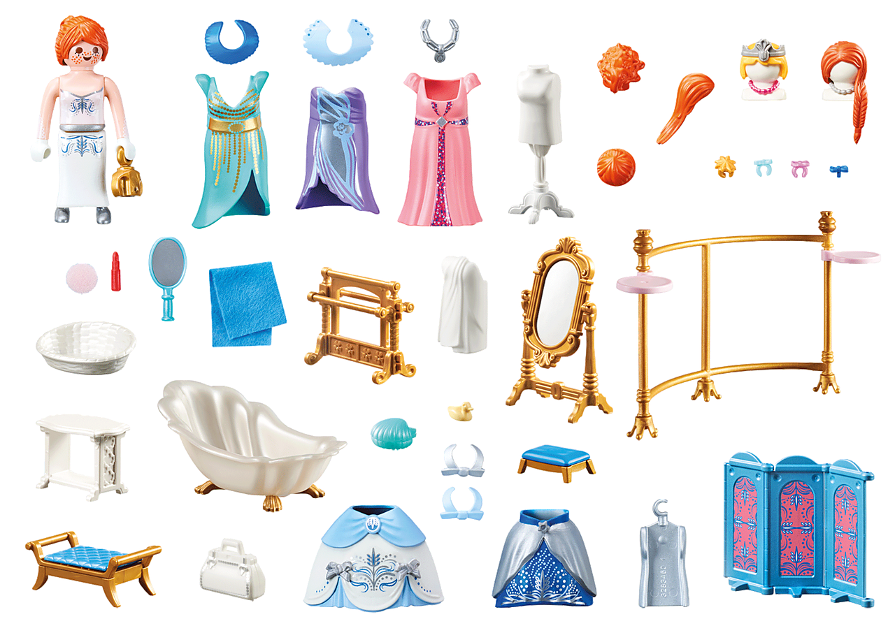 Figures: 1 Princess Accessories: 1 bathtub. 1 screen. 2 shelf compartments. 1 coat stand. 1 tailor’s dummy. 3 coat hangers. 2 busts. 1 crown. 3 chains. 1 plaited hairstyle. 1 short hairstyle. 3 different hairpieces. 2 collars. 1 mirror. 1 hand mirror. 1 bench. 1 side table. 1 towel holder 1 stool. 6 bows. 1 shell. 1 sponge. 1 bottle. 1 bath duck. 1 lipstick. 3 hair bows. 2 skirt bows. 1 hoop skirt with bows. 1 hoop skirt with belt. 1 handbag. 1 basket. 2 towels. 1 bath towel (2-piece). 3 different dresses (2-piece each)